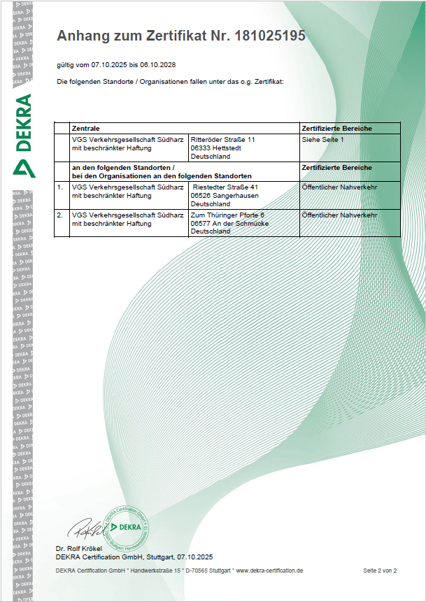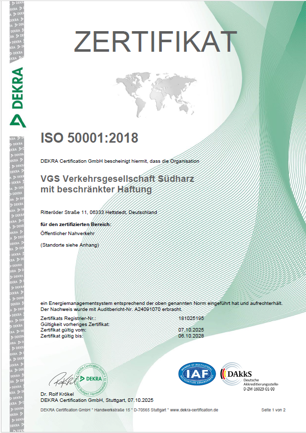 Die Verkehrsgesellschaft Südharz mbH (VGS) hat im zertifizierten Bereich „Öffentlicher Personennahverkehr“ ein Energiemanagementsystem nach der internationalen Norm ISO 50001:2018 eingeführt und aufrechterhalten. Damit setzen wir ein klares Zeichen für nachhaltiges Wirtschaften und verantwortungsbewussten Ressourceneinsatz.